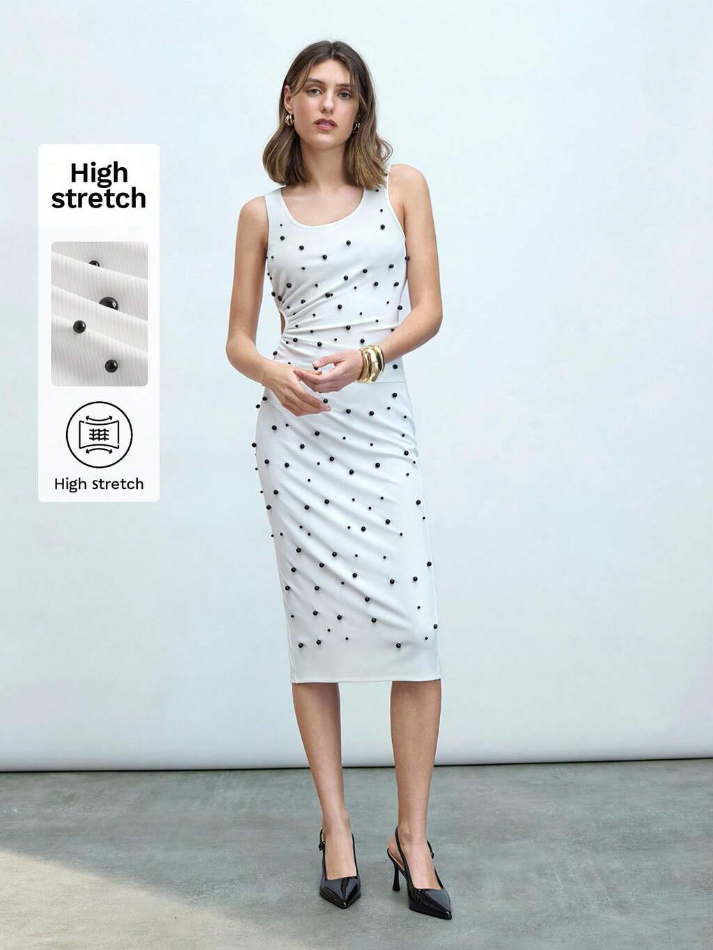SHEIN Maija Women's Black Pearl Studded Sleeveless Top With Cutout Detail And White Side Stripe Elastic Waistband Skirt, Versatile Elegant Urban Design, Knit Ribbed Fabric, Sleeveless Crew Neck Top And Medium/Low Rise Waistband Skirt, Business Casual Countryside Music Festival Graceful Outfit, Cruise Dress