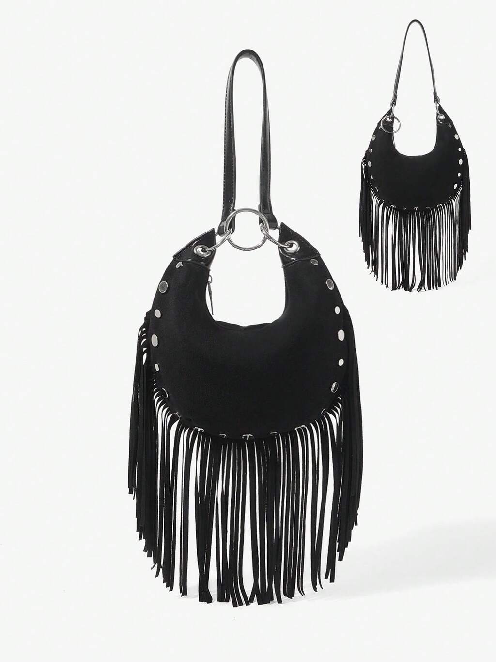 SHEIN Maija Ladies, Women Shoulder Bag,Hobo Bag, PU,Black,Tassels,Fashionable, Elegant , Simple, Personalized, Versatile, Classic, For Commute, Office,Date, Daily,Shopping, Afternoon Tea