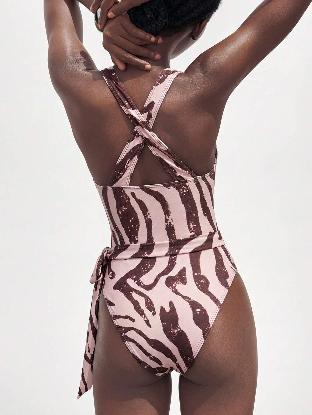 SHEIN Maija Women's Colorblock Zebra Print Sleeveless Fitted One-Piece Swimsuit, Summer Beach Animal Print Swimsuit Animal Print Bathing Suit One Piece Swimsuit Brown Print Swimsuit Animal Print Swimwear Zebra Print Swimsuit One Piece Bathing Suit Women's Swimsuits One Piece Swimsuit Women