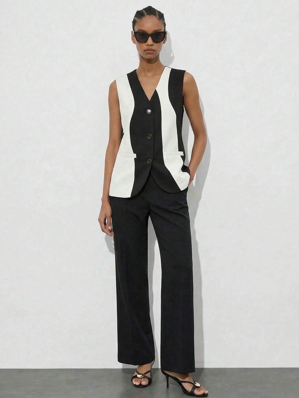 SHEIN Maija Women's Black V-Neck Button Front Fitted Vest Top And Elastic Waist Button Pocket Loose Long Pants 2 Pieces Suit Set, Casual Business Outfit For Women, Suitable For Halloween Business Casual Woman Office Outfits For Women In Fall/Winter
