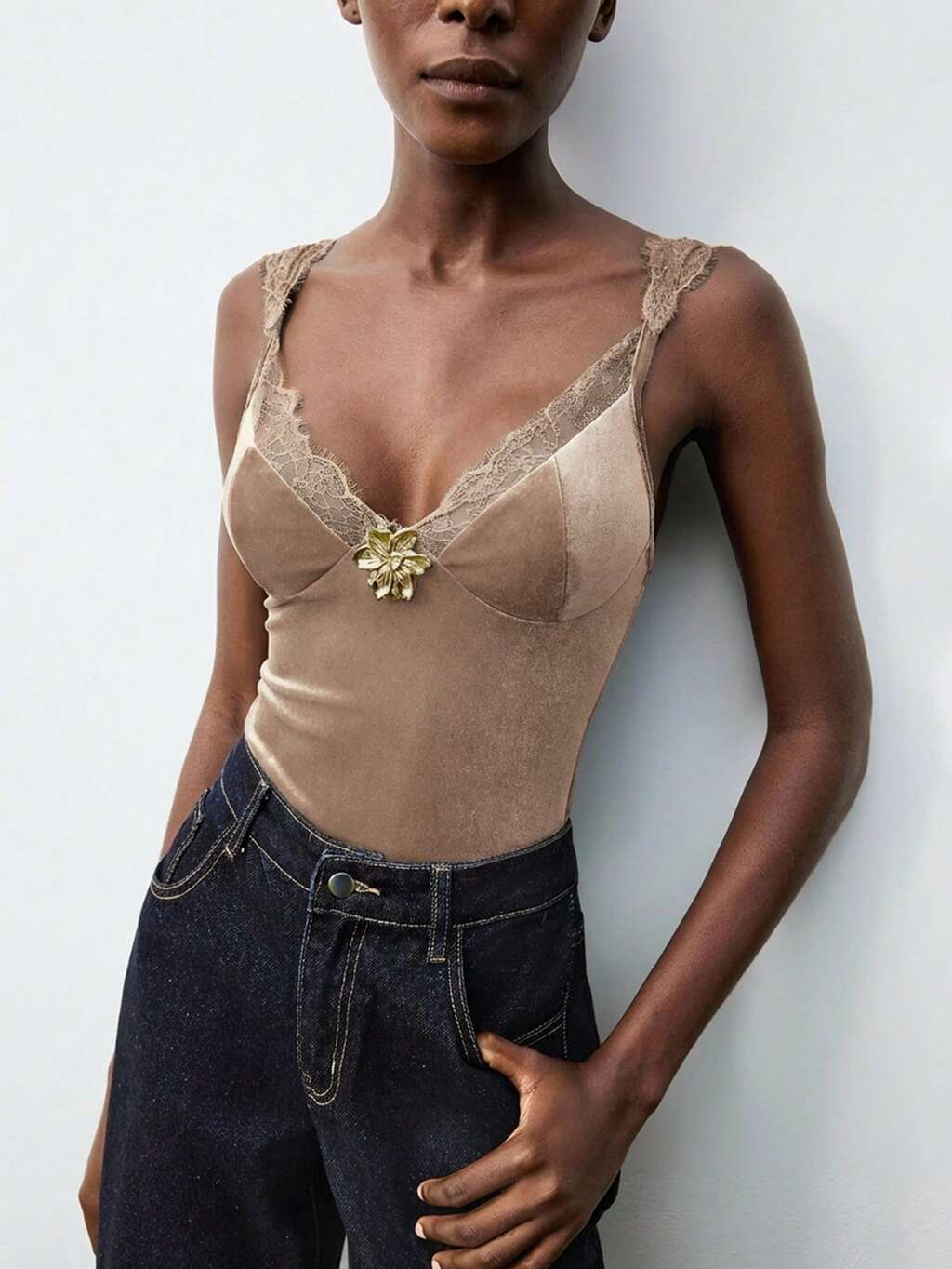 SHEIN Maija 2026 Elegant Velvet & Lace Patchwork Metal Decor Women Camisole Top, Spring Break Party Top Beach Summer Holiday Each Vacation For Women Summer For Women Going Out Graduation Casual For Women