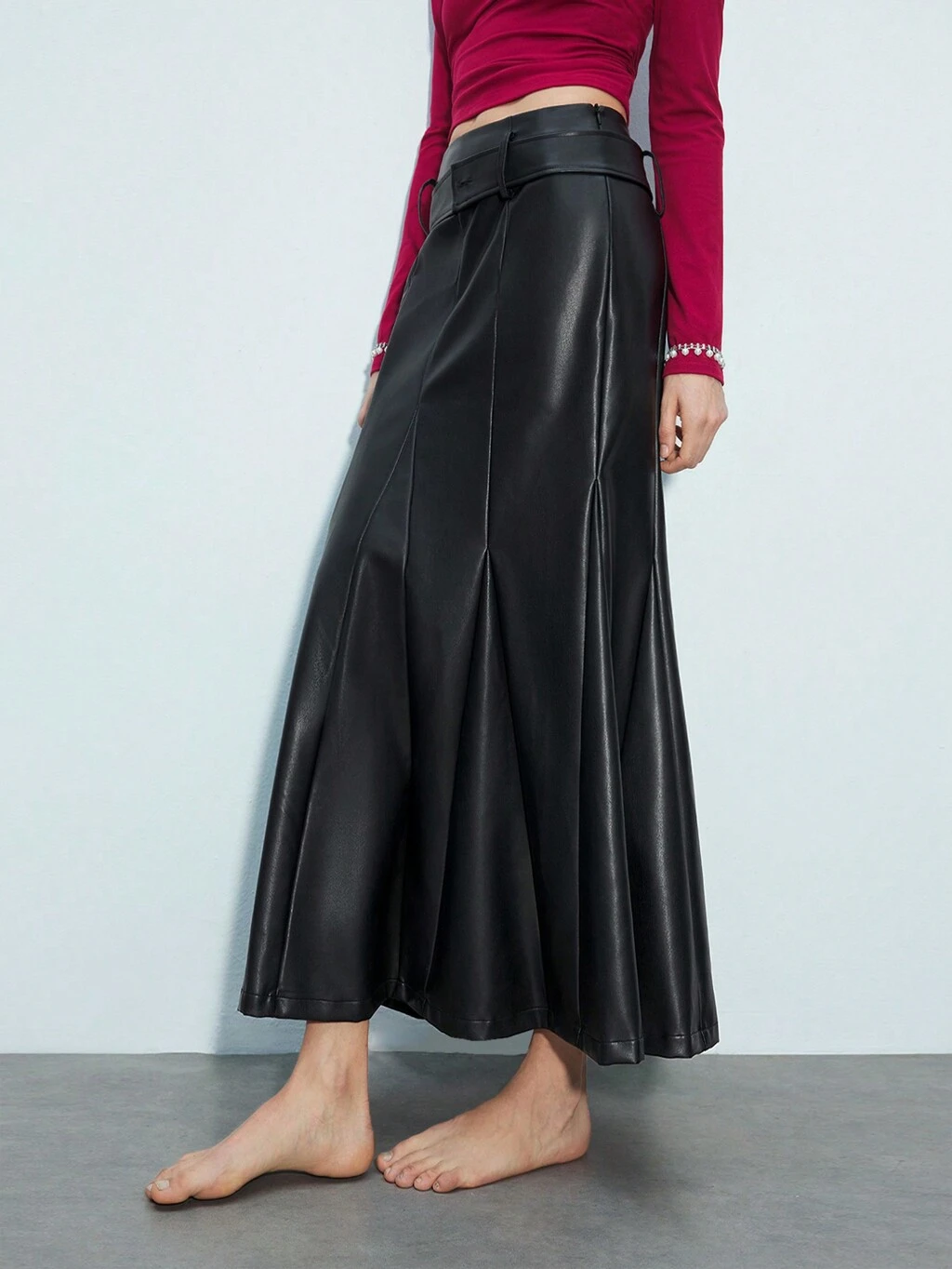 SHEIN Maija Women's Solid Color PU Leather Pleated A-Line Skirt, Elegant Fashion Festival