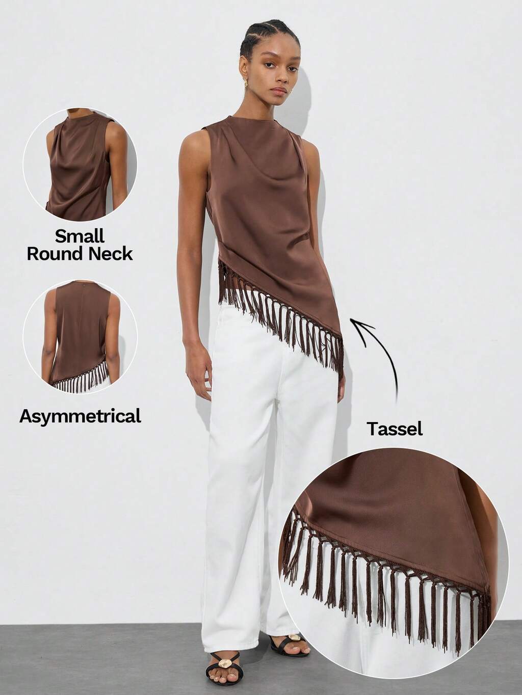 SHEIN Maija Women's Solid Color Sleeveless Top With Asymmetrical Hem And Tassel Decor, Summer St Patrick's Day Women Easter Summer Easter Women Party Top Beach Summer Holiday Each Vacation For Women Summer For Women Going Out Graduation Graduation Casual Casual Blouses For Women,Summer Top