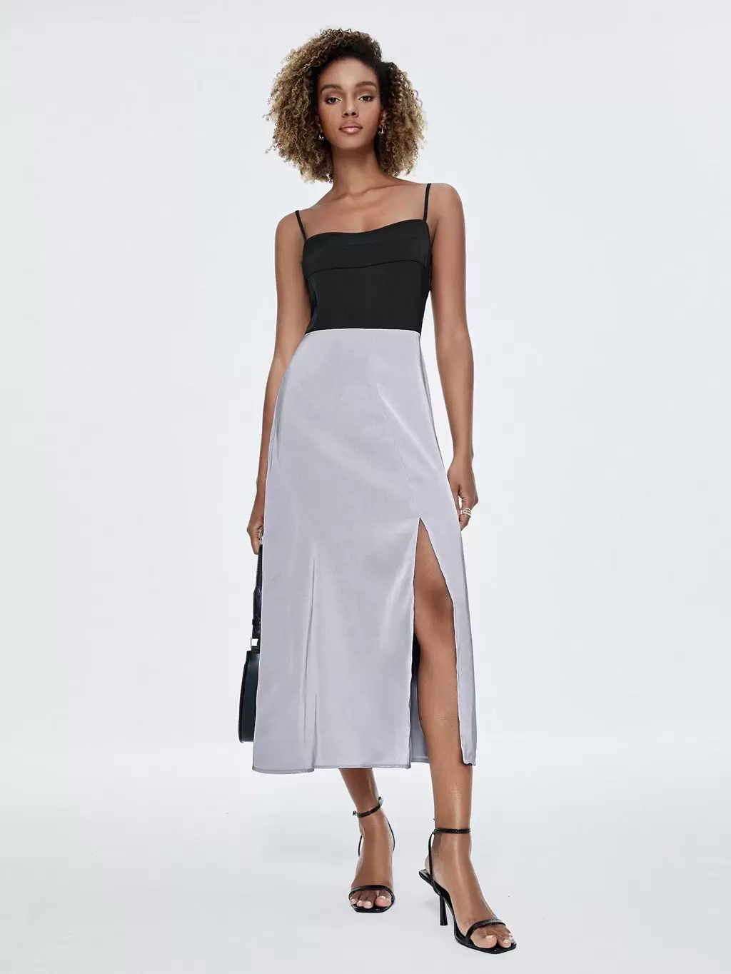 SHEIN Maija Women's Color Block Black & Silver Side Slit Elegant Slip Dress With Spaghetti Straps