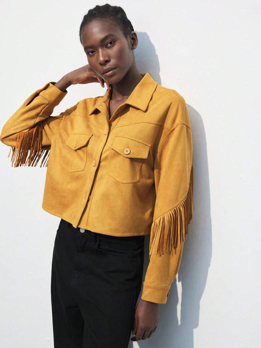 SHEIN Maija Damen Jacke mit Knopfverschluss, Langarm, Tasche und Quastenverzierung, Einfarbig, Lässig