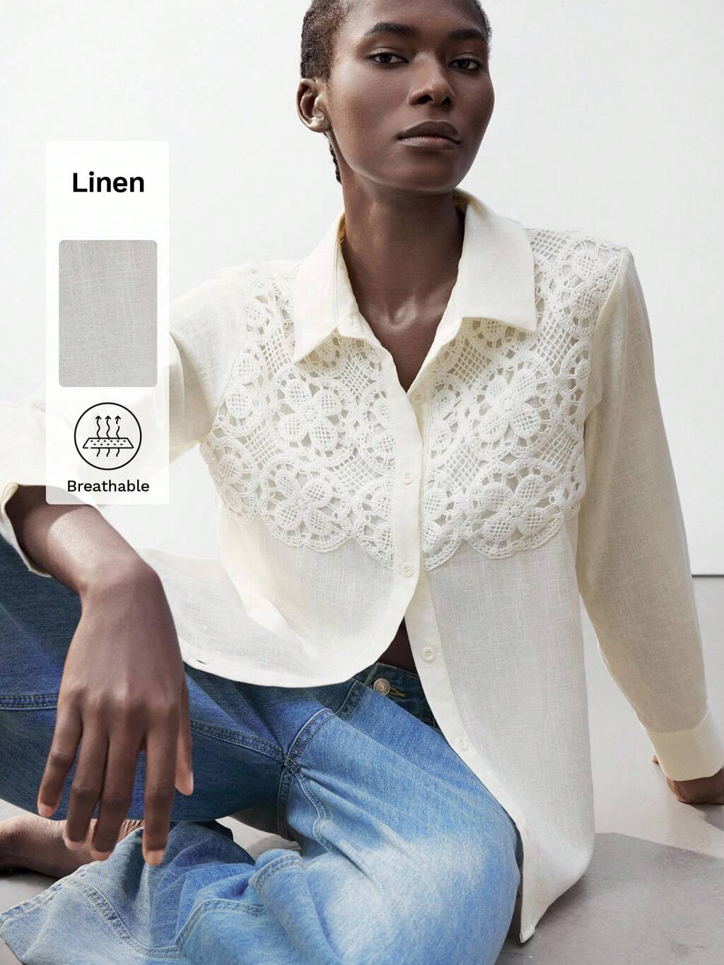 SHEIN Maija Damen Aprikot strukturierter Stoff Kontrast Spitze Langarm Knopfleiste Freizeithemd, geeignet für Alltag und Urlaub, passend für Boho-Stil im Frühling