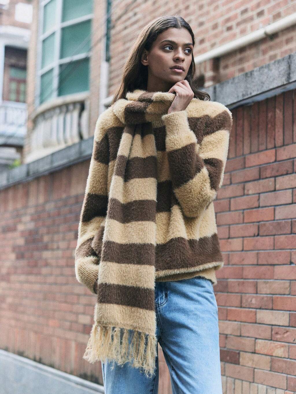 SHEIN Maija Damen Herbst/Winter Pullover mit braunem khakifarbenem gestreiftem Muster und Rollkragen, Langarm