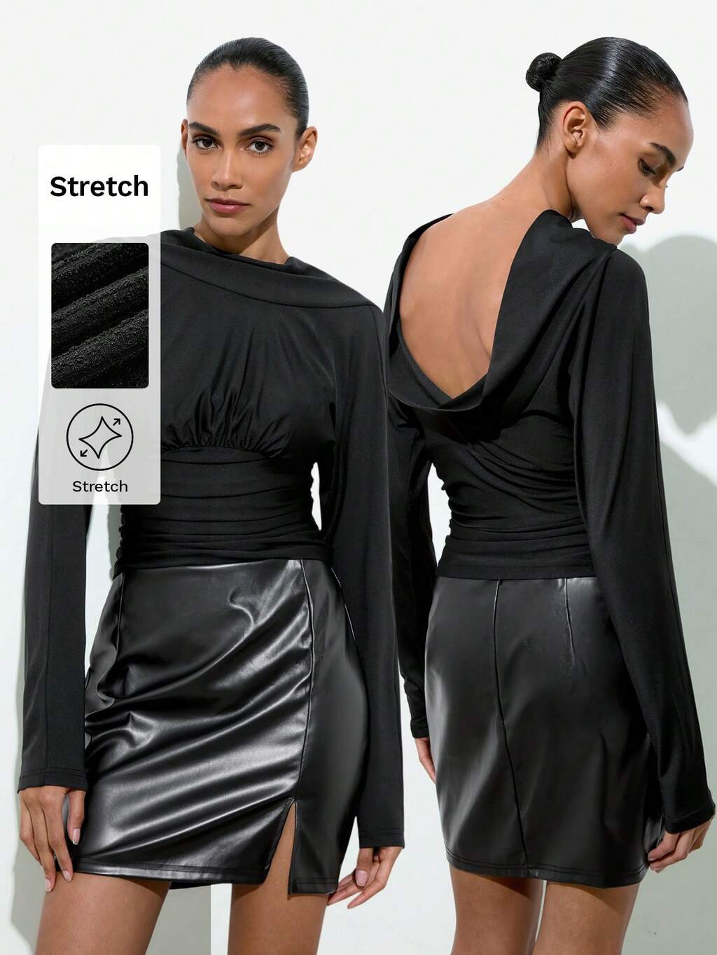 SHEIN Maija Damen Schwarze Bluse mit tiefem Ausschnitt, rückenfreiem Design und geraffter Taille, Herbst/Winter