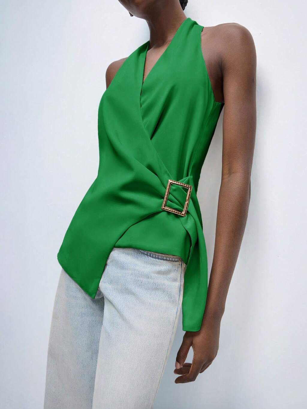 SHEIN Maija Camiseta sin mangas con cuello halter, escote en V profundo, decoración metálica y bajo con abertura sexy para mujer