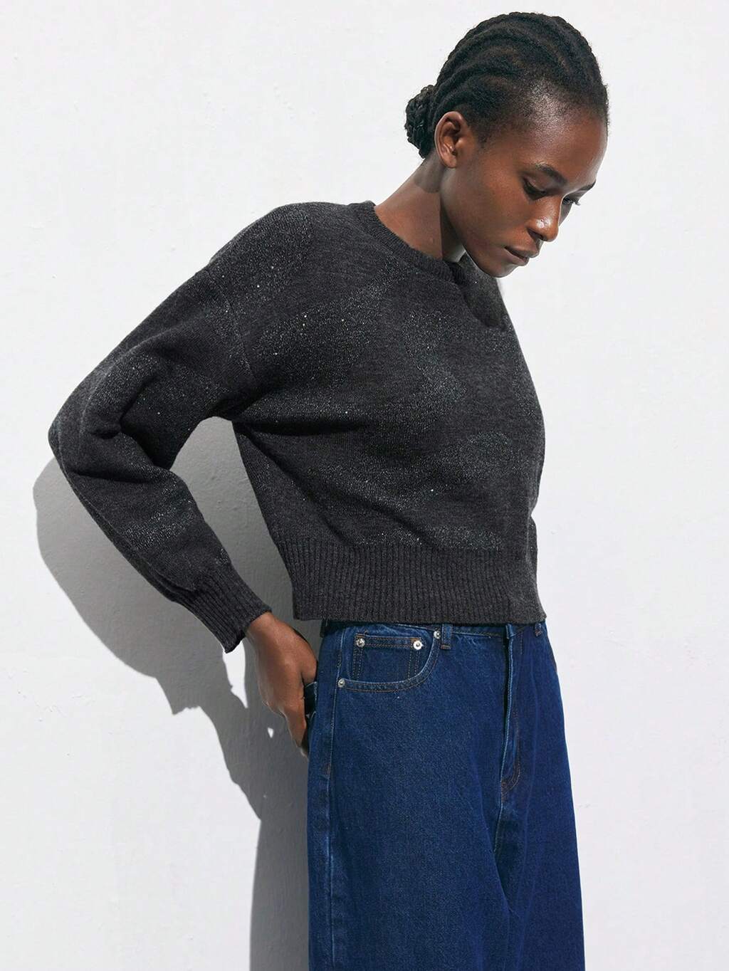 SHEIN Maija Suéter holgado, versátil y cómodo para el uso diario con cuello redondo gris, decorado con cristales de metal, perfecto para el inicio de la primavera