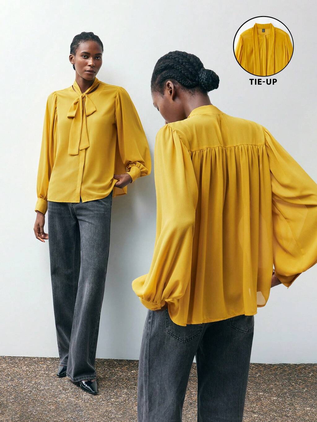 SHEIN Maija Blusa de manga larga de mezclilla con decoración de metal y diseño con lazo en la espalda para mujer