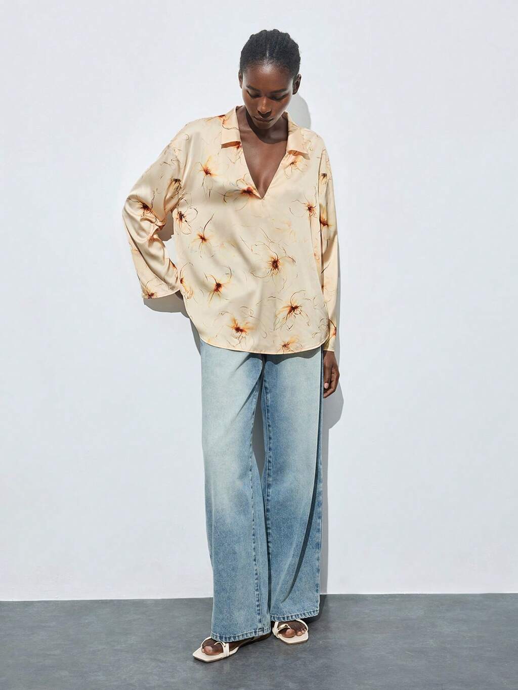 SHEIN Maija Blusa de verano con escote en V con estampado floral amarillo para mujer, elegante, cómoda y versátil