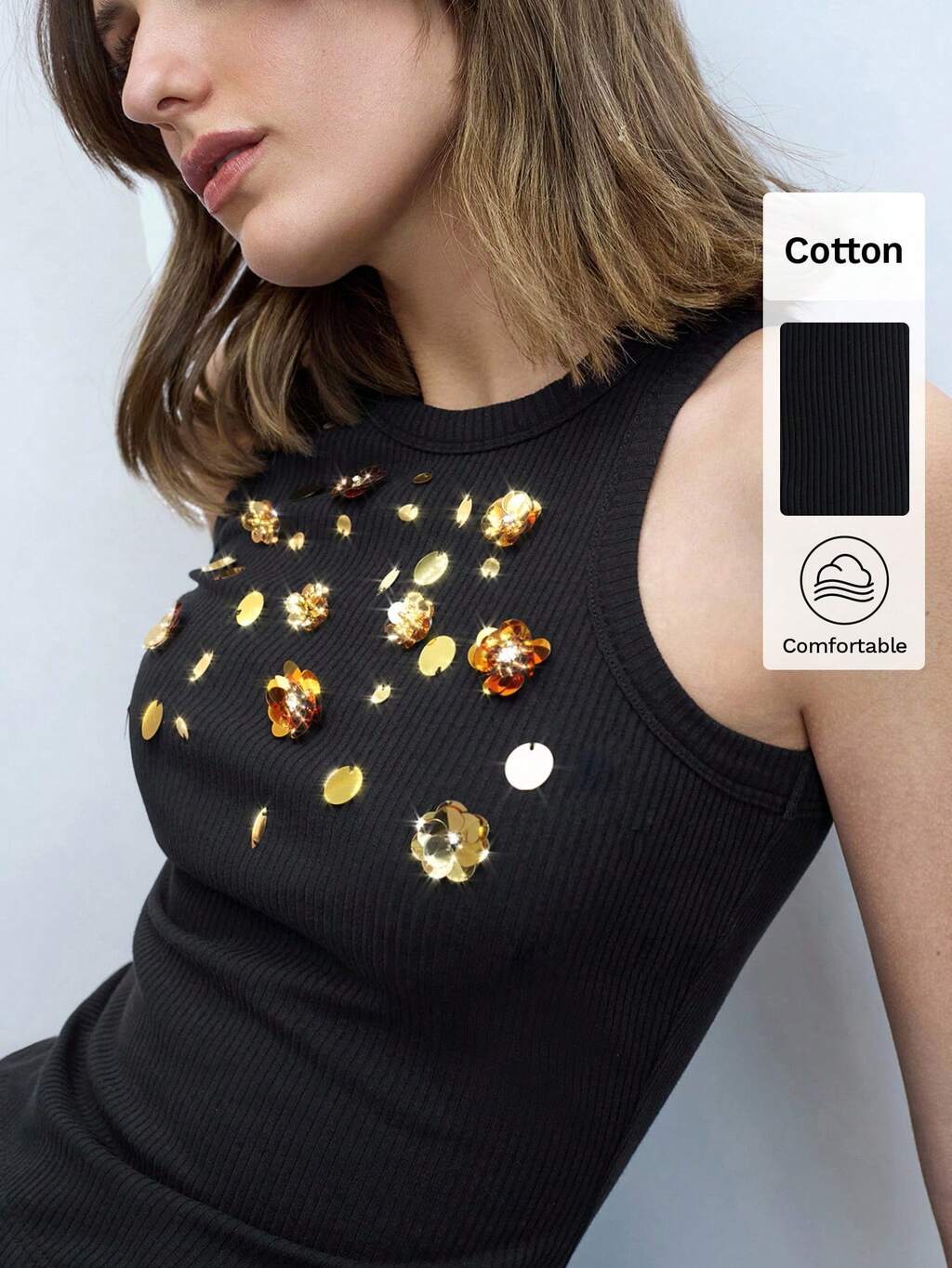 SHEIN Maija Vestido mini de punto ajustado con cuello redondo, decoración metálica floral 3D y sin mangas, versátil y de moda para el verano. Adecuado para vacaciones, festivales de música, fiestas, 4 de julio, mes del orgullo. Conjunto de verano para mujer.