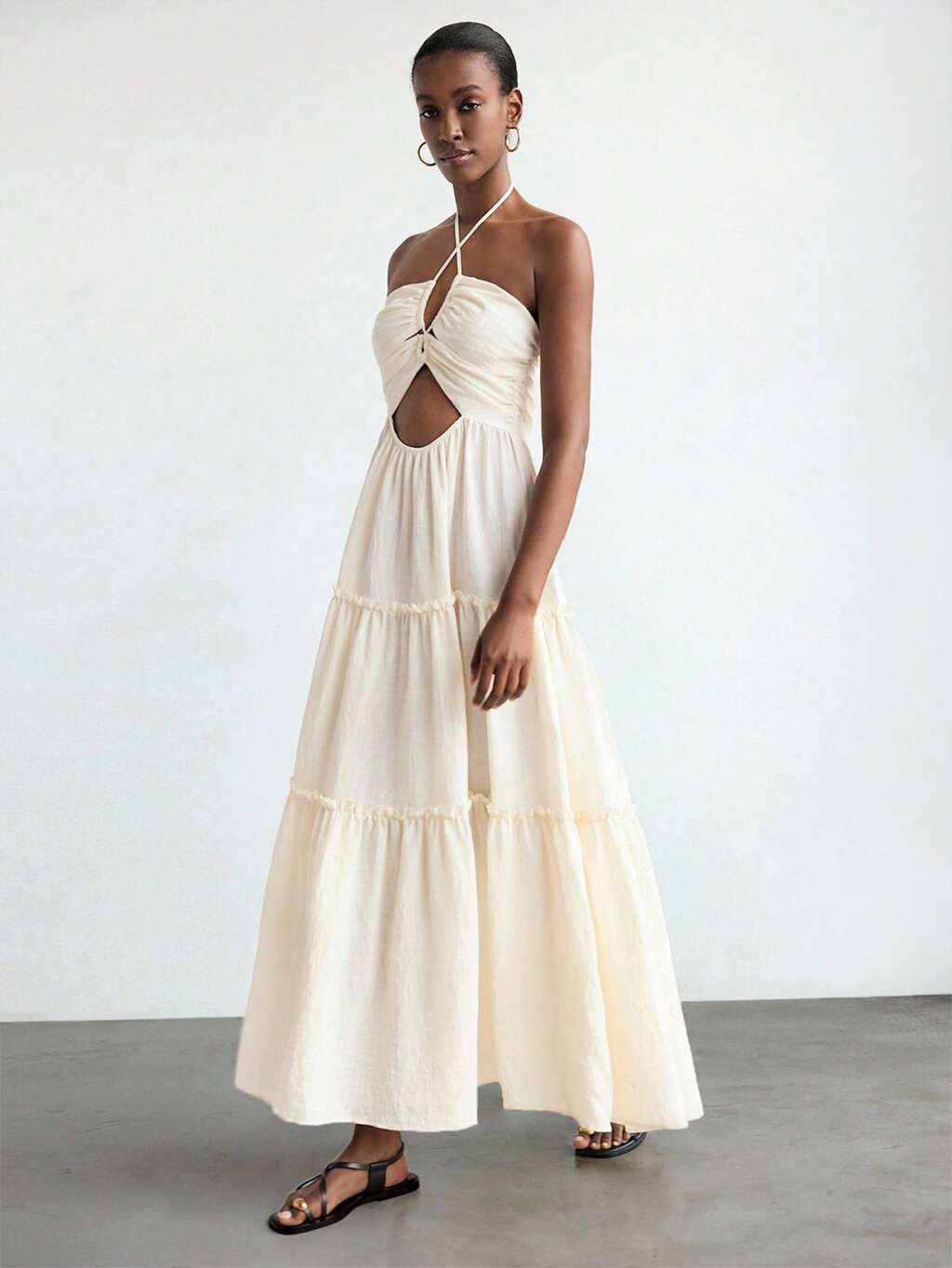 SHEIN Maija Vestido de verano para mujer de color albaricoque con recortes calados, espalda descubierta y cuello halter, con dobladillo con volantes. Vestido de playa casual suelto y sexy para vacaciones