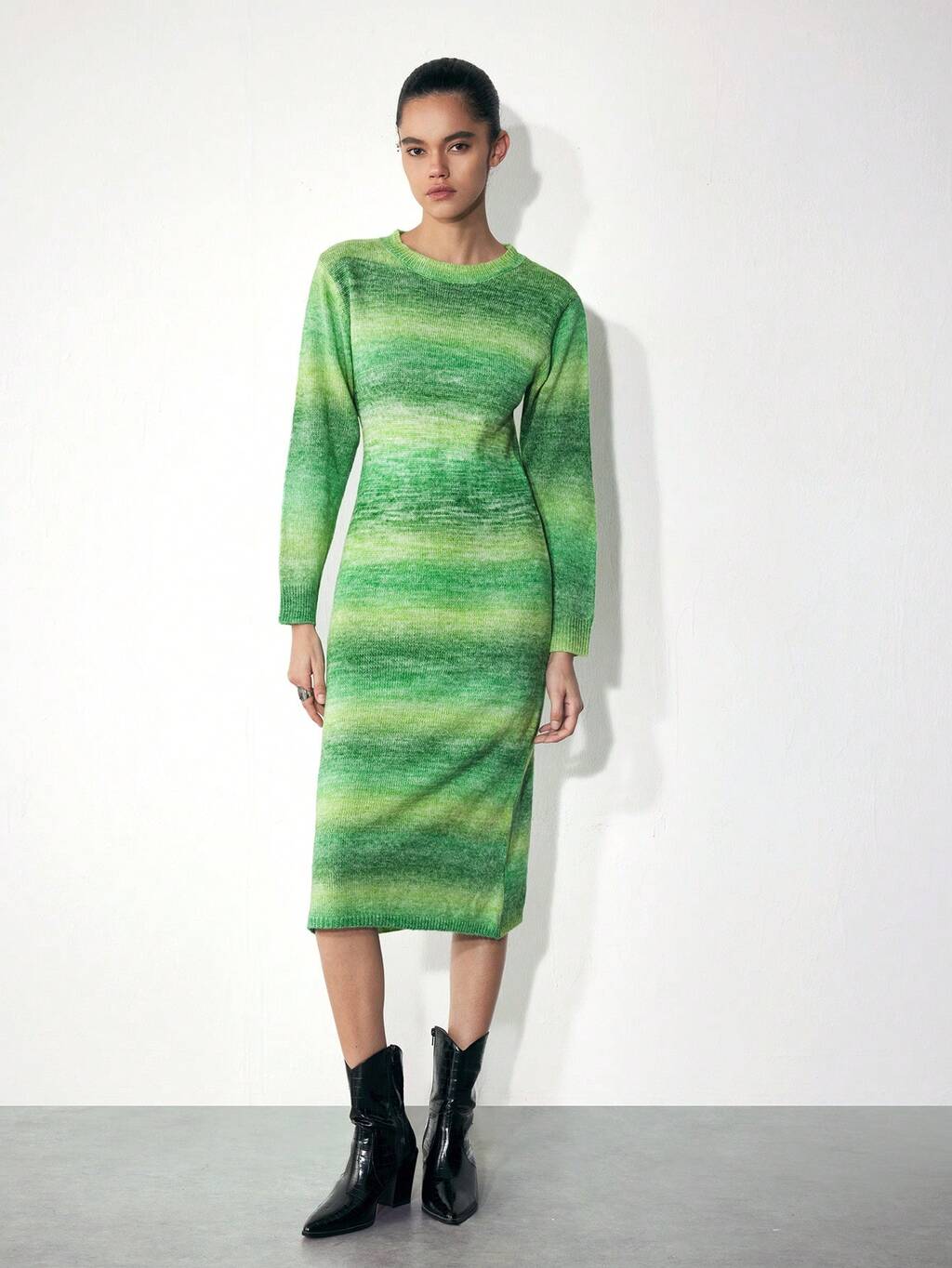 SHEIN Maija Vestido de suéter ajustado de manga larga, versátil y casual, con cuello redondo y bloque de color verde para mujer en otoño/invierno