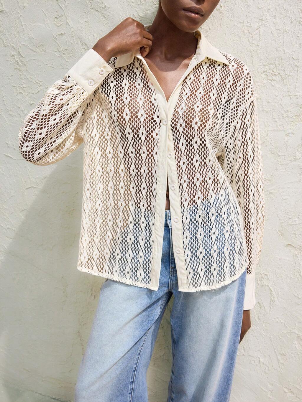 SHEIN Maija Camisa casual transparente de manga larga con botones delanteros de unicolor, estilo bohemio para festivales para mujer