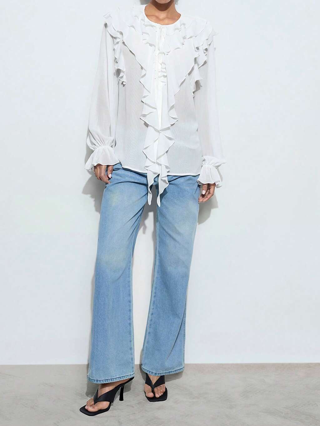 SHEIN Maija Nueva blusa de manga larga de tejido texturizado, elegante, casual y moderna, con cintura acinturada, para un estilo urbano chic, para damas, para otoño/invierno