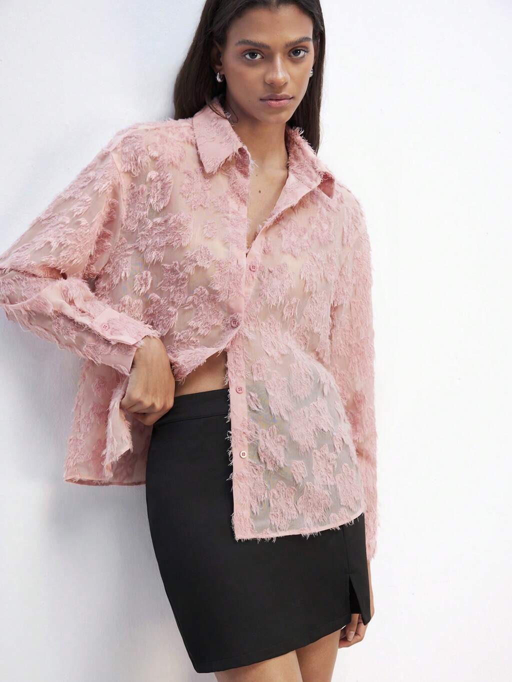 SHEIN Maija Blusa de manga larga elegante con textura perforada de color rosa para mujer, otoño/invierno