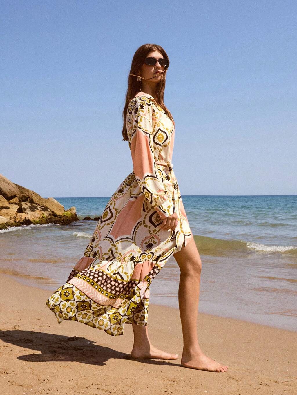 SHEIN Maija Vestido de verano casual y elegante con cuello de camisa, manga larga, cintura marcada y línea A, con estampado de totem y floral, en estilo patchwork, bohemio y de vacaciones, para un look moderno y nómada, apropiado para conciertos en el campo y con un toque de elegancia de alto nivel.