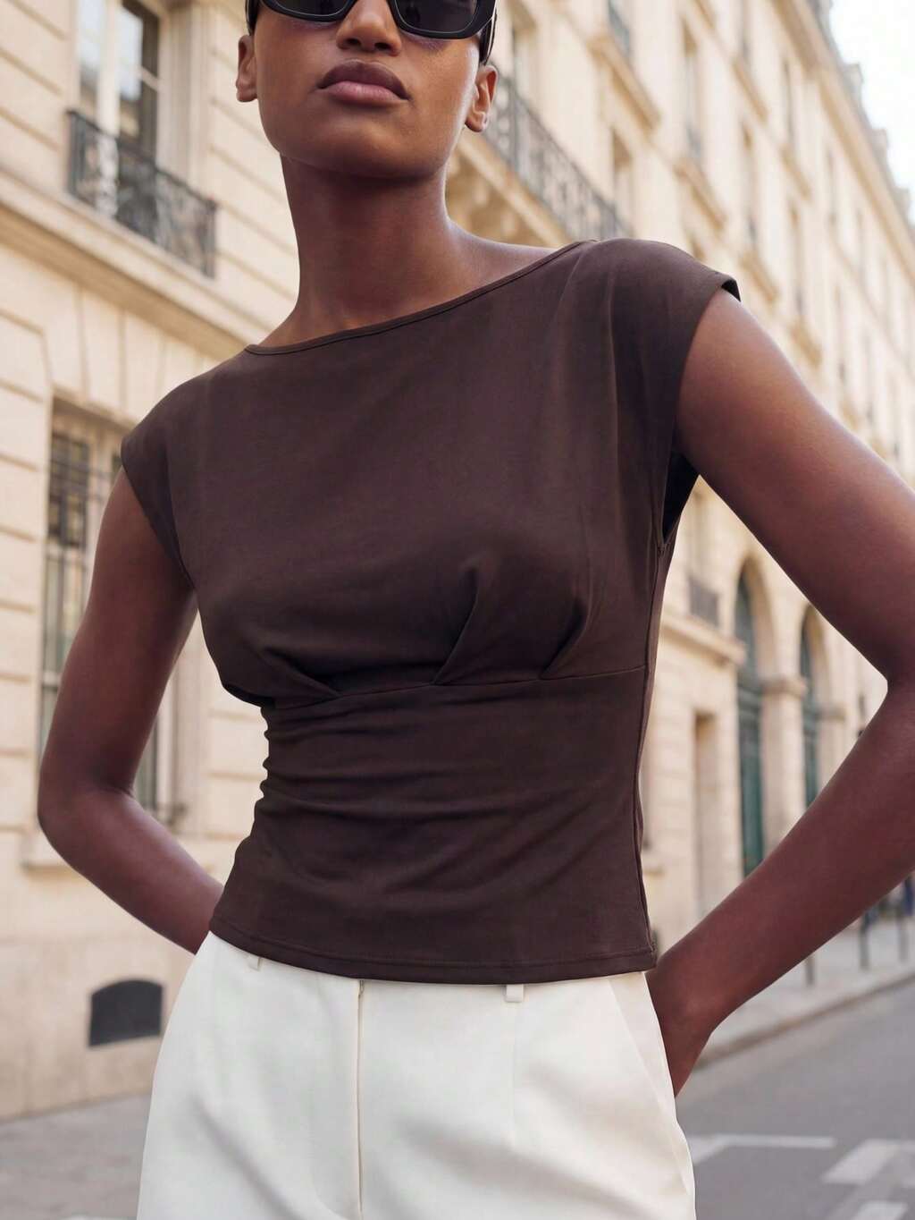 SHEIN Maija Camiseta de mujer de manga acuchillada y fruncida de moda minimalista, para uso casual