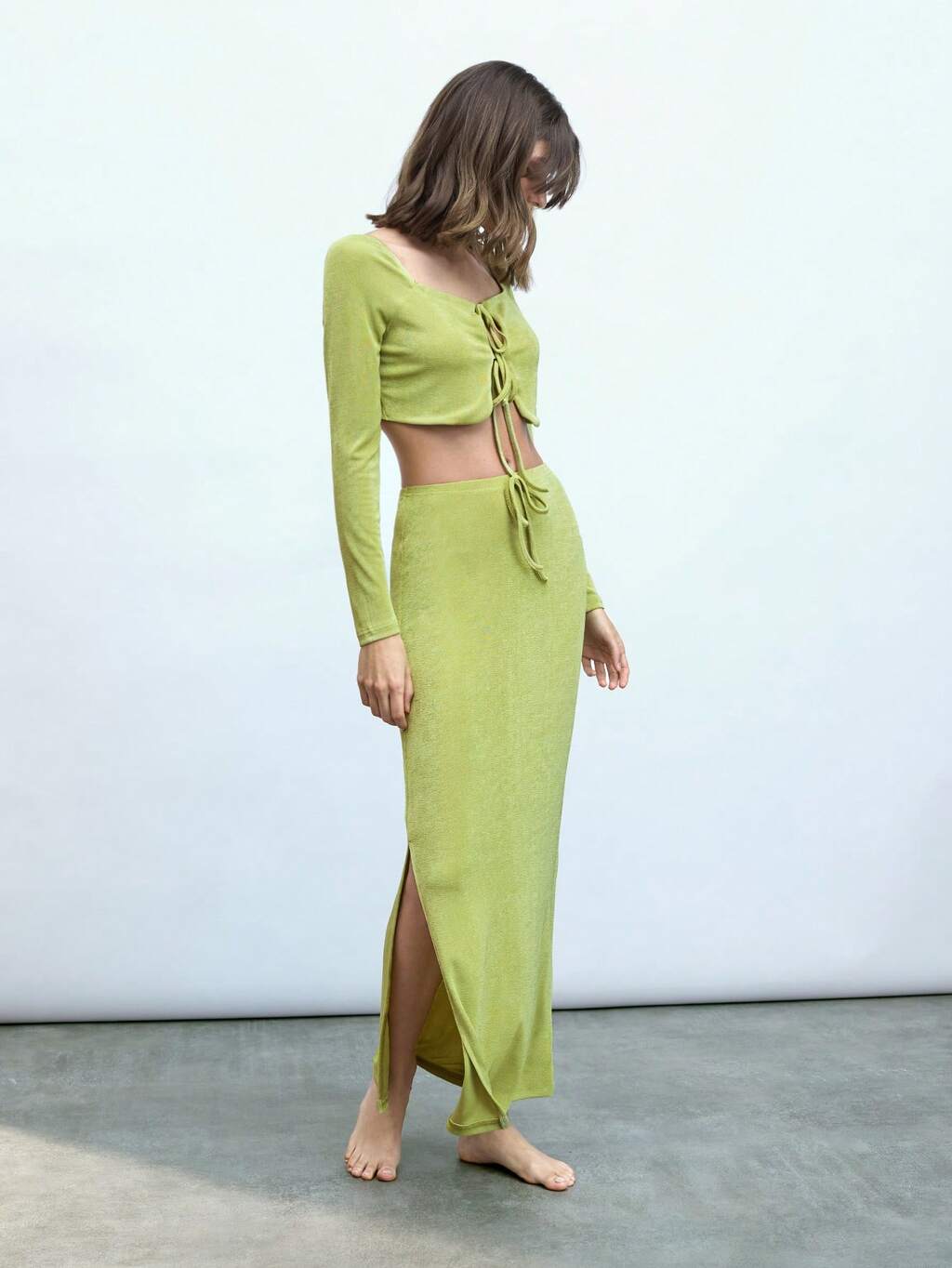 SHEIN Maija Conjunto de 2 piezas para mujer con top corto verde liso con cordones y falda con abertura lateral, cintura entallada, conjunto de verano