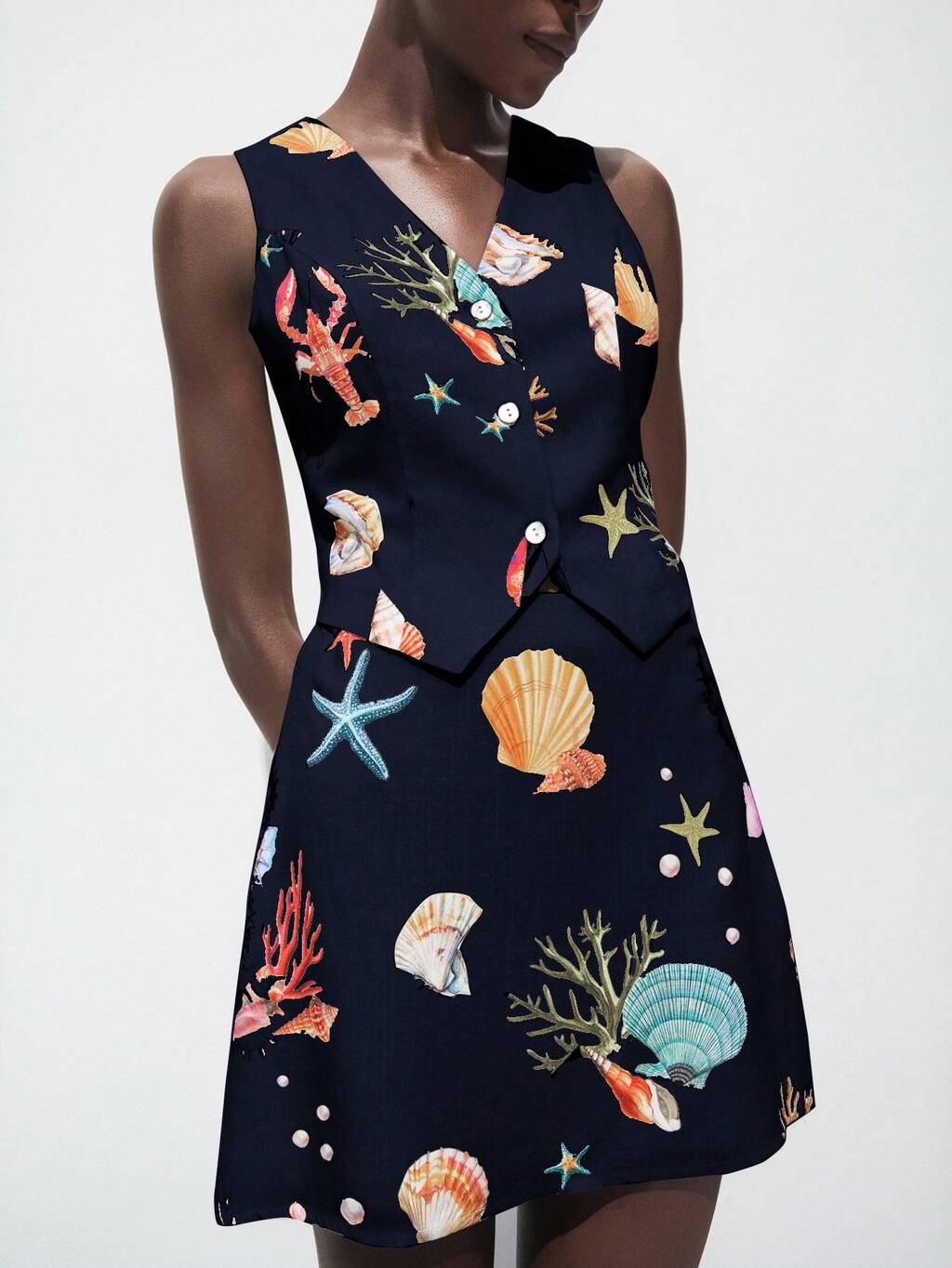 SHEIN Maija Conjunto de 2 piezas de chaleco de una hilera con estampado de estrella de mar y concha y minifalda, estilo urbano casual de negocios para playa y resort, estilo bohemio