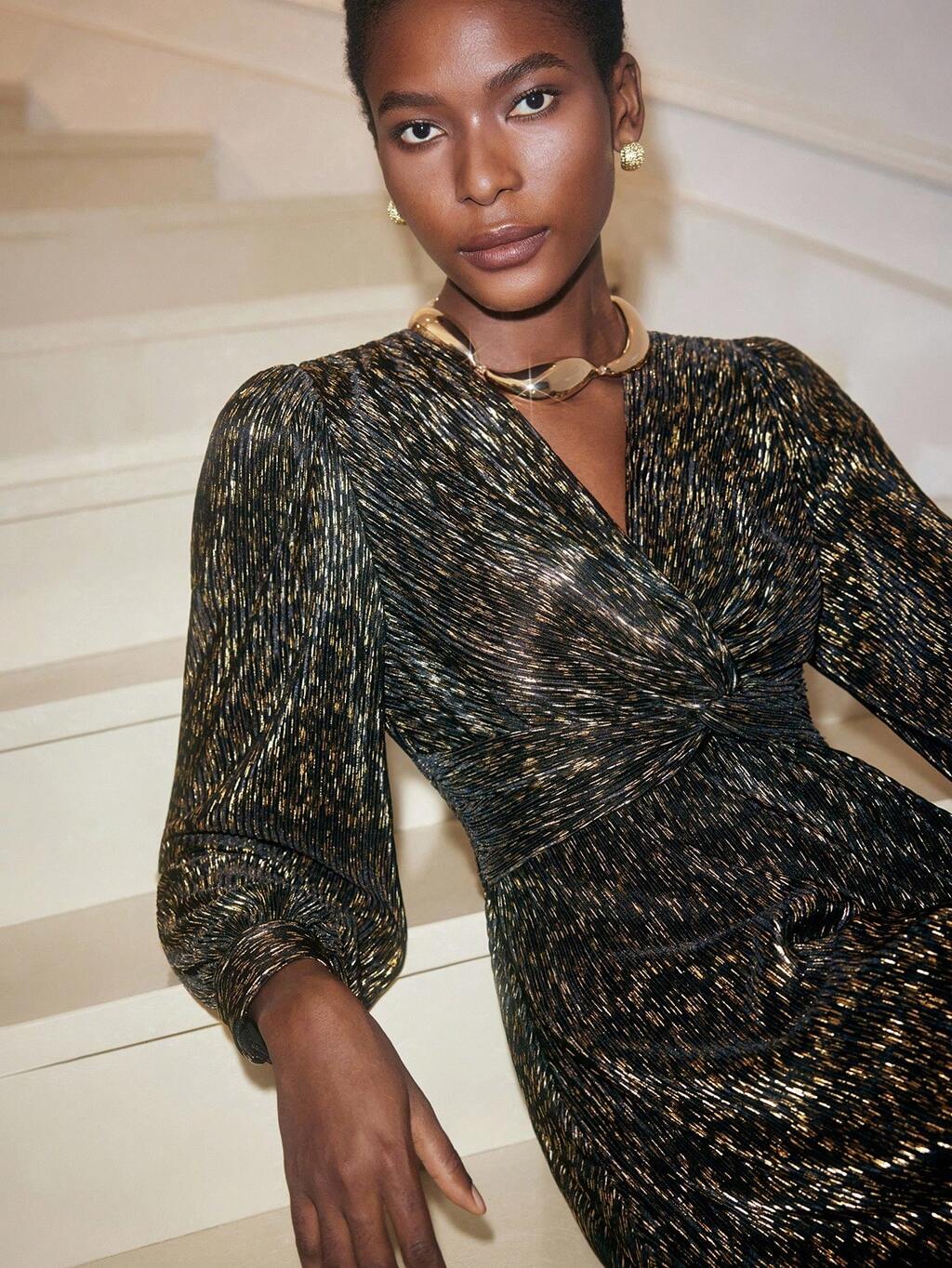 SHEIN Maija Vestido de mujer de manga larga con cuello en V y pliegues con lámina dorada negra, adecuado para Navidad, fiestas y reuniones