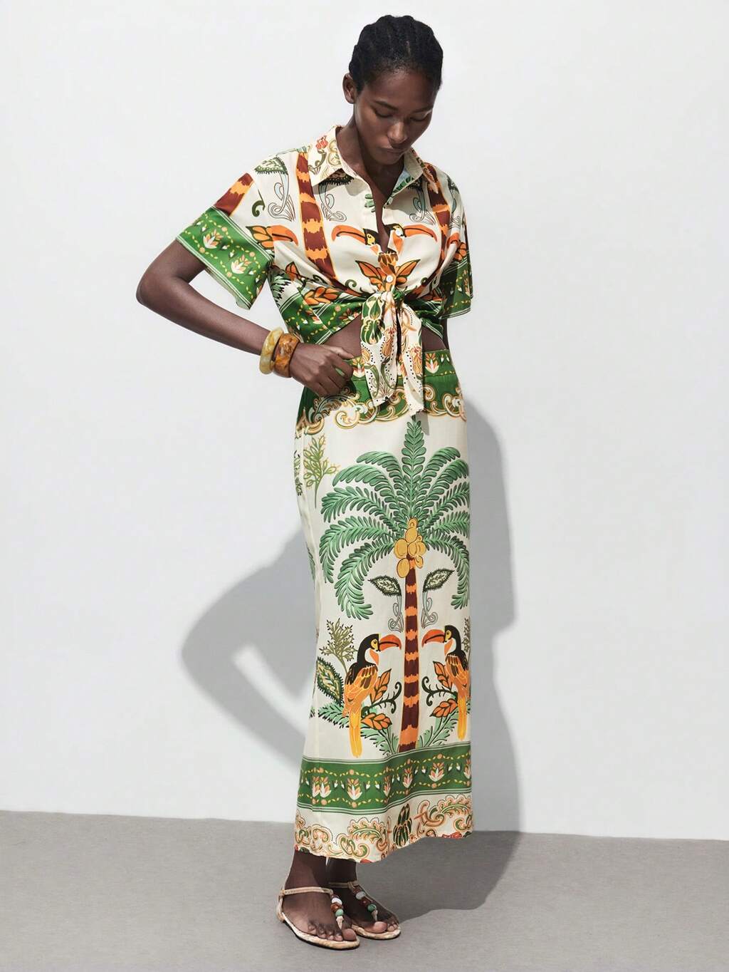 SHEIN Maija Falda con estampado tropical, falda con tucanes, ropa de otoño para mujer