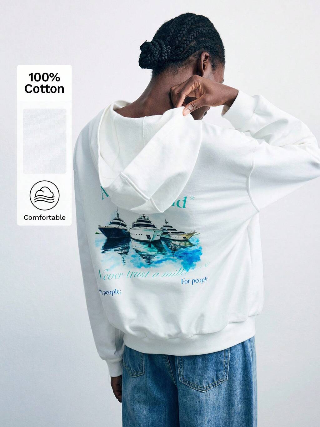 SHEIN X Arenal Sound Sudadera con capucha casual de manga larga con estampado de lema, hombros caídos, bolsillo, sudaderas con gráficos, sudadera blanca con gráfico de yate, sudadera con gráfico de barco, ropa de otoño e invierno para mujer