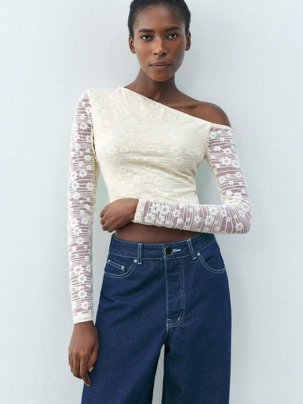 SHEIN Maija Blusa blanca de mujer de manga larga, hombros caídos, de encaje blanco elegante y cómoda, versátil, moderna y elegante para fiestas, Año Nuevo, San Valentín y festivales elegantes