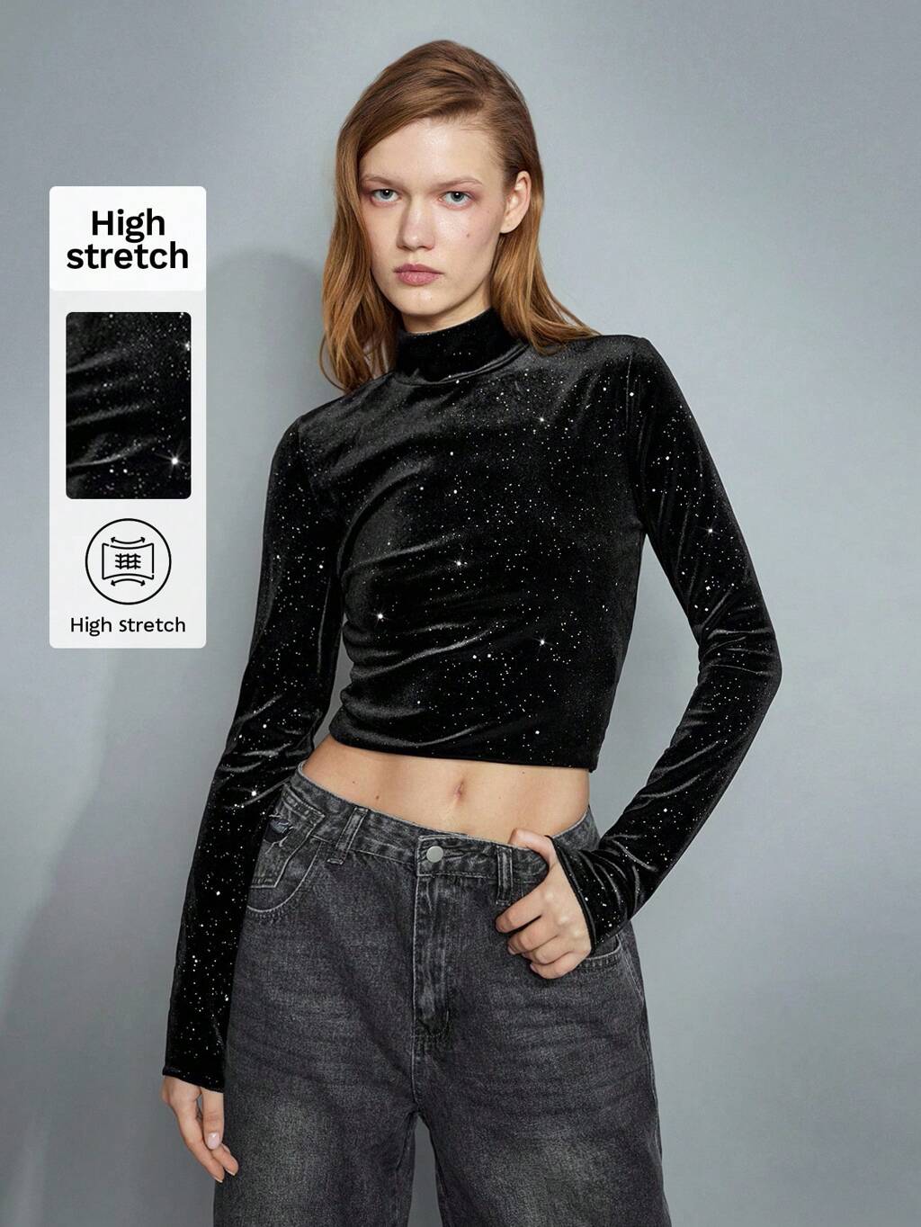 SHEIN Maija Blusa de manga larga con cuello alto sin espalda con lentejuelas para mujer, elegante y versátil para fiestas de Año Nuevo, Día de San Valentín y festivales