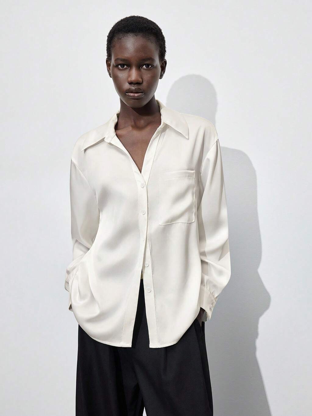 SHEIN Maija Chemise à manches longues ample à simple boutonnage avec poche, en tissu satin sergé épais. Style simple et , décontracté urbain, tenue de villégiature, blouse élégante de bureau. Blouse décontractée pour femmes, idéale pour la Saint-Patrick, Pâques, les fêtes, les vacances d'été, la plage, les sorties, la remise des diplômes.