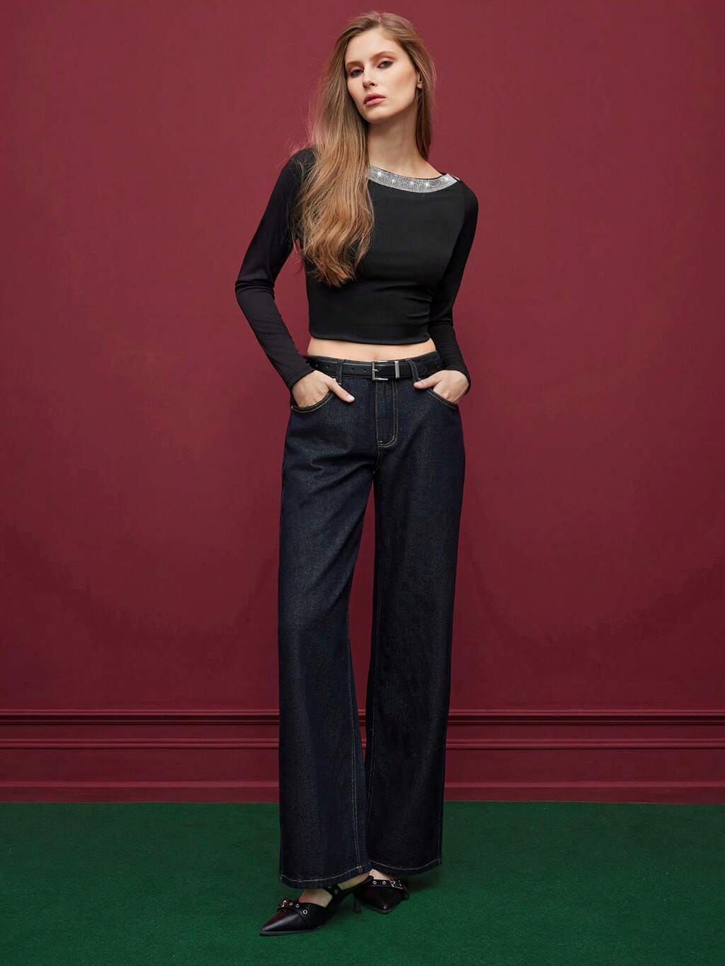 SHEIN Maija t-shirt ajusté à manches longues orné de strass élégant pour femmes, printemps/automne