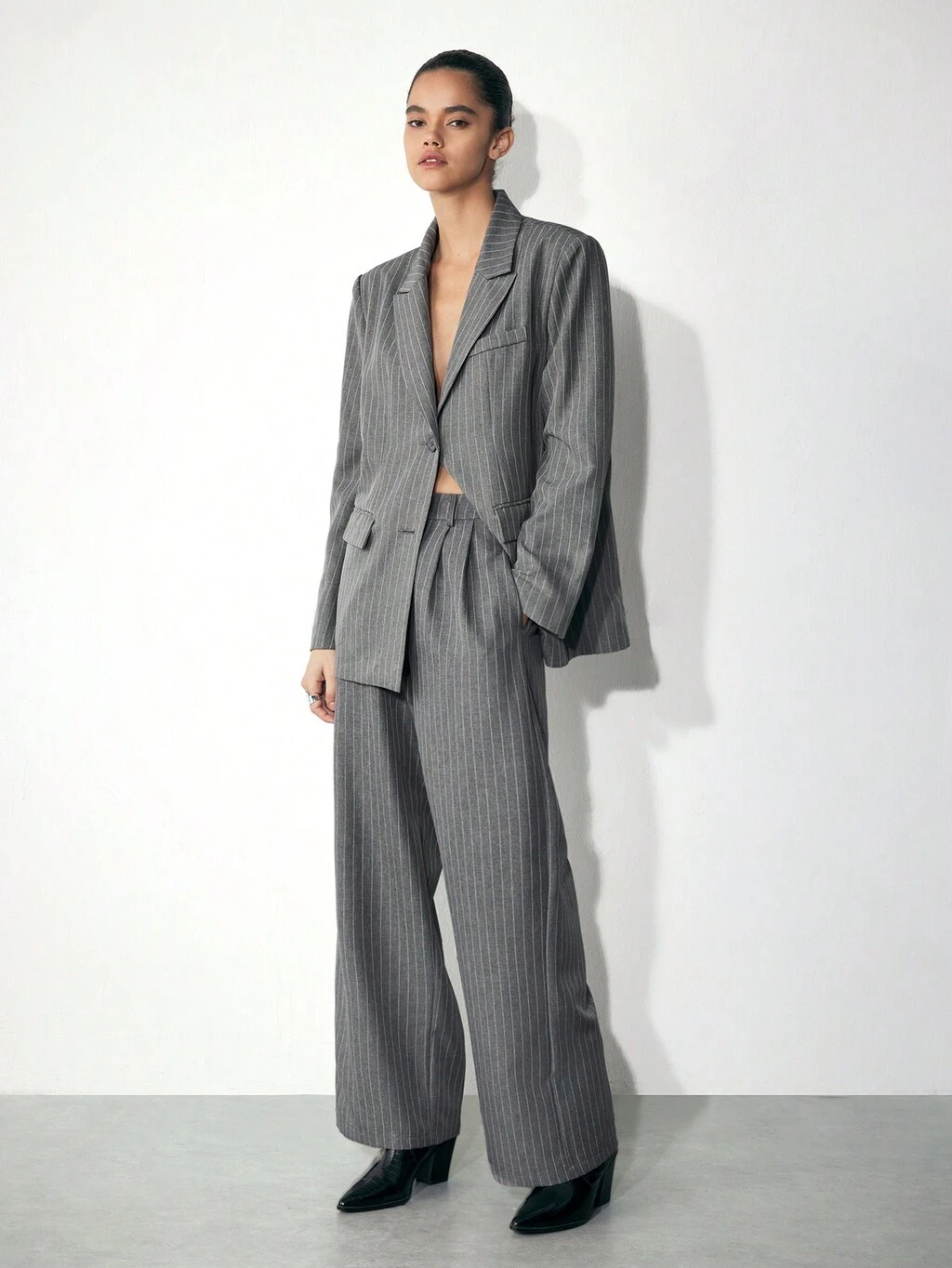 SHEIN Maija Pantalon gris décontracté à rayures, taille élastique froncée, jambes larges, style mode casual, automne/hiver