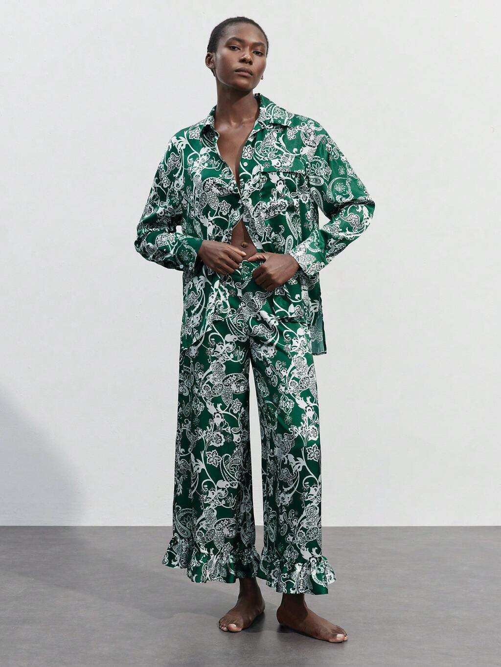 SHEIN Maija 2 pièces Ensemble chemisier casual boho à imprimé floral et pantalon à volants. Pour femmes, convient pour les vacances d'automne