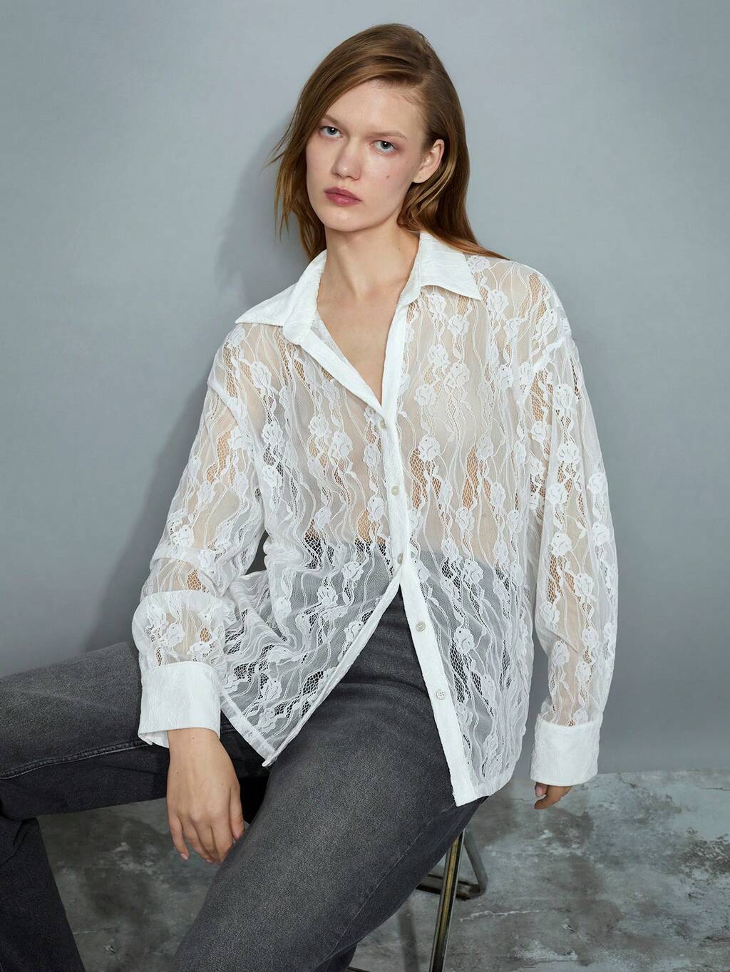 SHEIN Maija Blouse femme blanche semi-transparente en tissu floral, polyvalente, moderne et élégante pour les fêtes du Nouvel An. Blouse femme blanche en dentelle sophistiquée et confortable, avec manches longues larges et épaules dénudées, idéale pour la Saint-Valentin et les festivals élégants