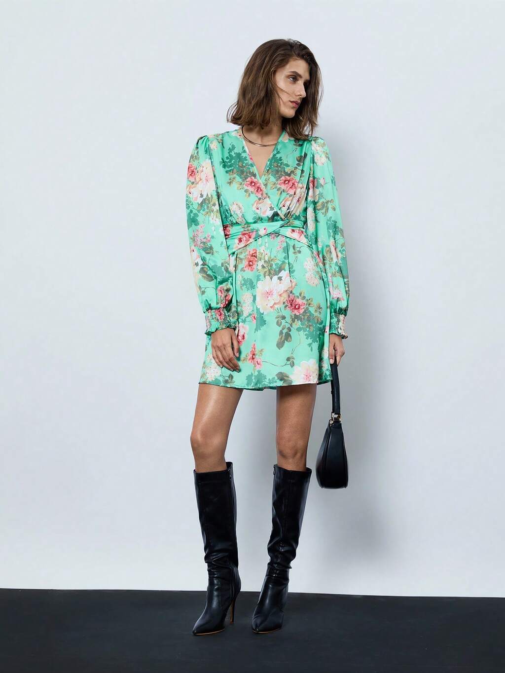 SHEIN Maija Vestito corto elegante a maniche lunghe con scollo a V e stampa floreale, in tessuto fluente, per la primavera e l estate delle donne