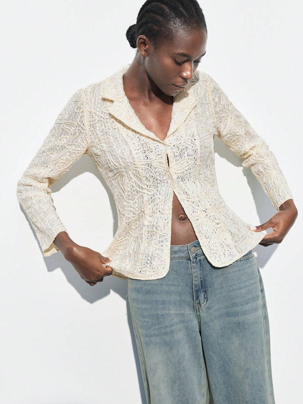 SHEIN Maija 2025 Moderna ed elegante camicia oversize da donna con colletto a tacca e fiocco, manica lunga, adatta per l'inizio dell'autunno, il ritorno a scuola, il 4 luglio, i concerti country, lo stile vintage, per insegnanti, di colore giallo burro, per feste, con cut-out, effetto patchwork e pizzo traforato, camicetta estiva bianca traforata da donna