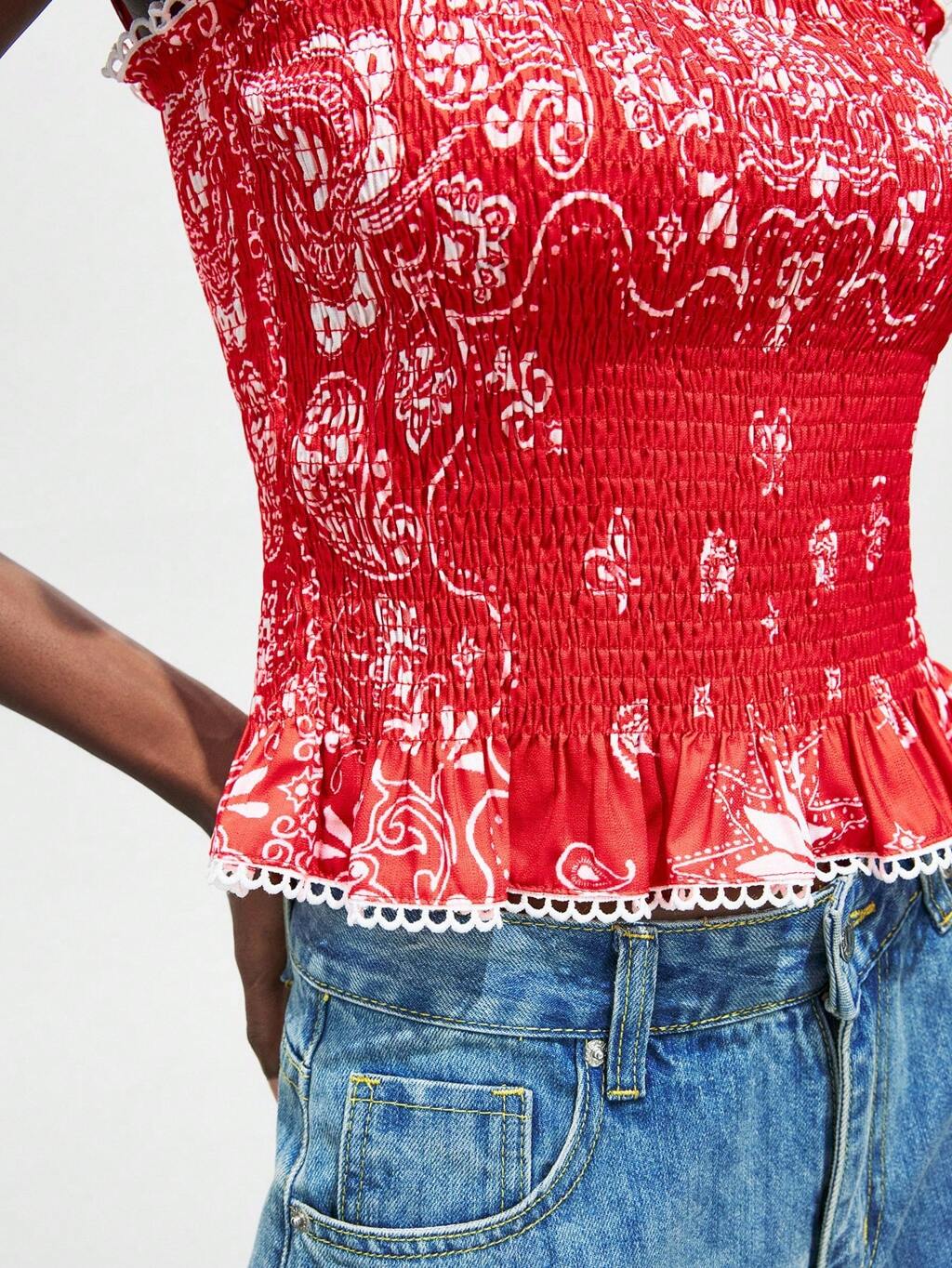 SHEIN Maija 2025 Nuova Maglietta da Donna con Stampa a Motivo Paisley sulle Spalle, Elegante, Romantica, Modesta, in Stile Y2K, Adatta per Festival di Musica Country, Vintage, Aeroporto, Strada, Matrimonio, Compleanno, Ognissanti, Ufficio, Appuntamento, Uscita, Ritorno a Scuola, Autunno