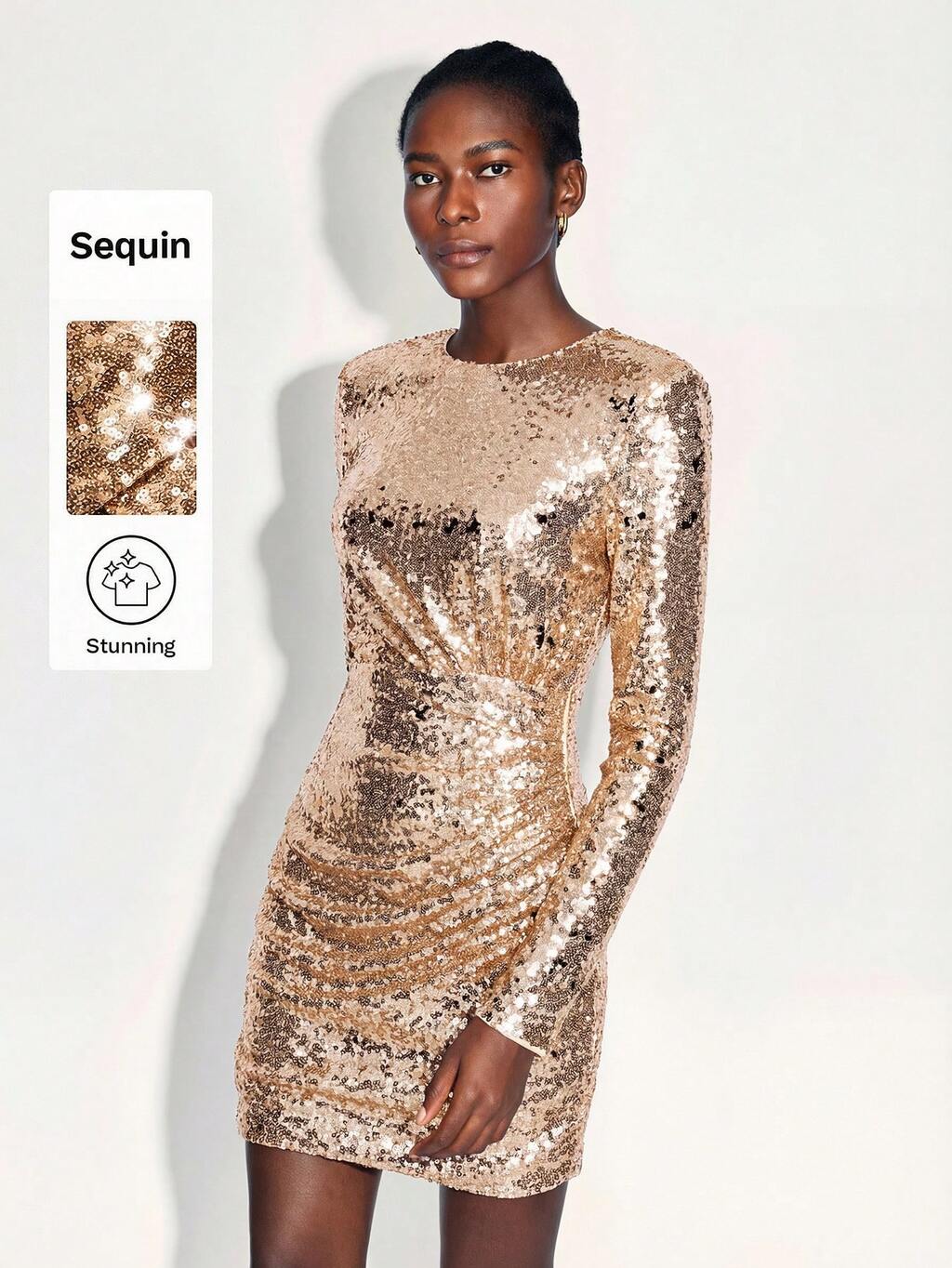 SHEIN Maija バーガンディ色 スパンコール装飾 長袖 フィットミニドレス、パーティーや集まりに最適