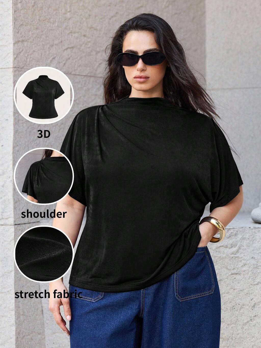 SHEIN Maija プラスサイズ レディース 無地 スタンドカラー 半袖 カジュアル ルーズTシャツ