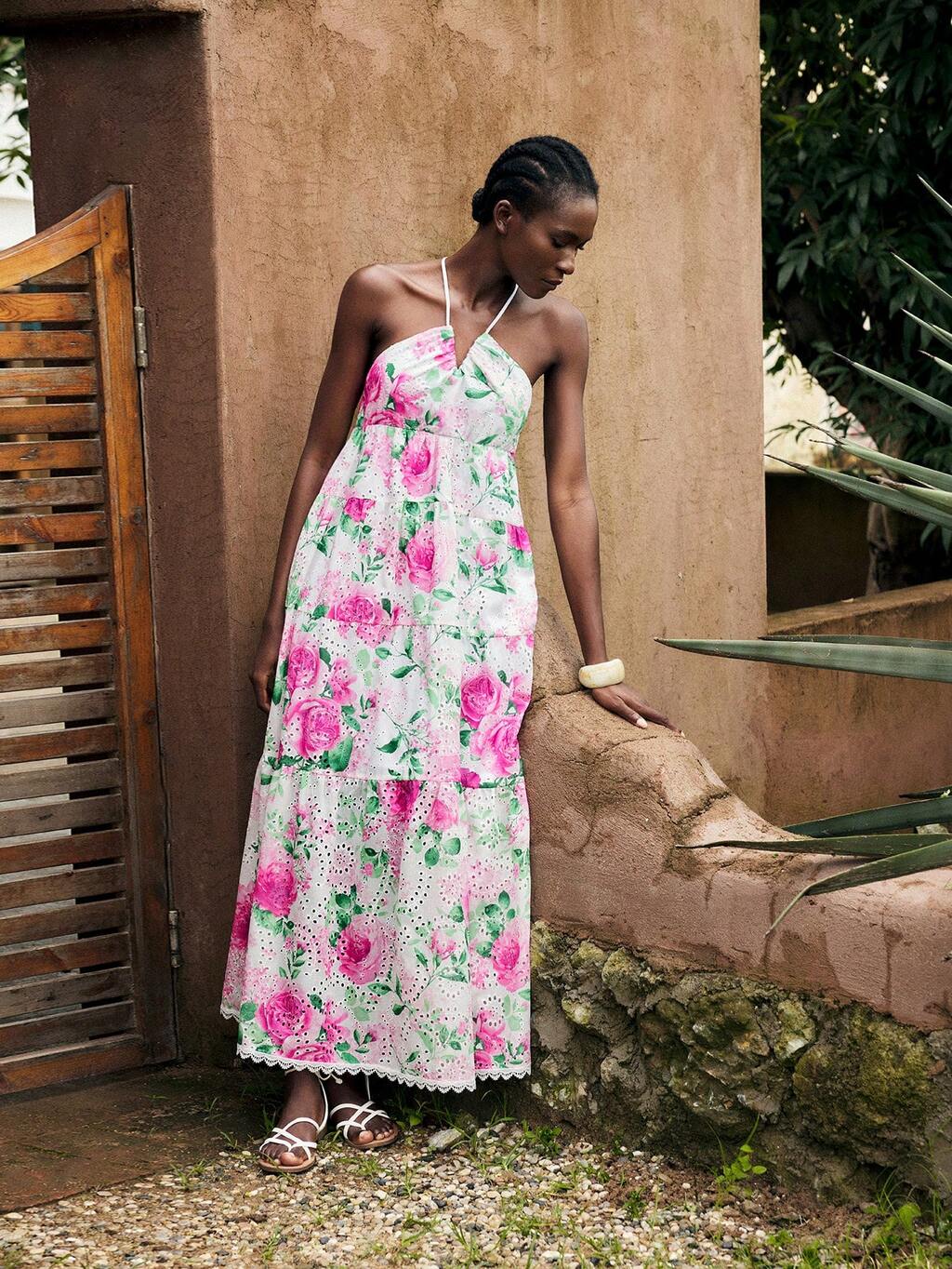 SHEIN Maija 女性用 ティーチャーユニフォーム フローラル刺繍 ホールター ルーズシルエット バケーションドレス