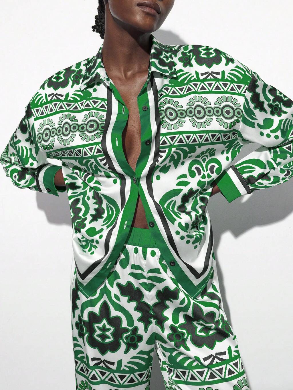 SHEIN Maija レディース ビンテージプリント ボタンシャツ、夏のカジュアルウェア