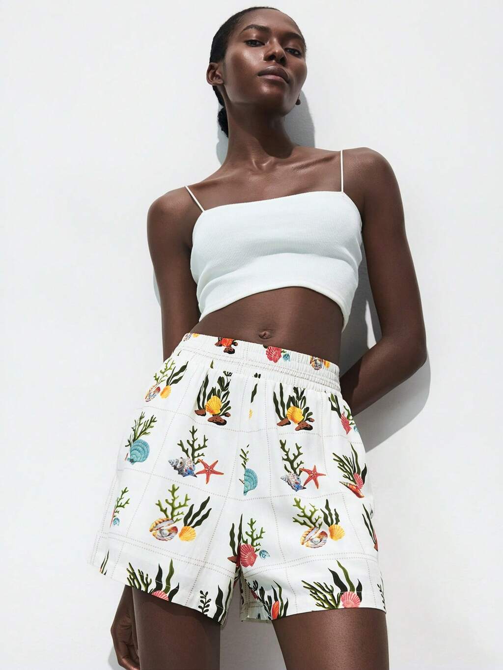 SHEIN Maija 女性用シェル柄 ウエスト伸縮性 ゆとりあるレッグ ショーツ、夏服、女性用夏のアウトフィット、バケーション、ボヘミアン、マイクロショーツ、フローイングショーツ、ビーチアウトフィット