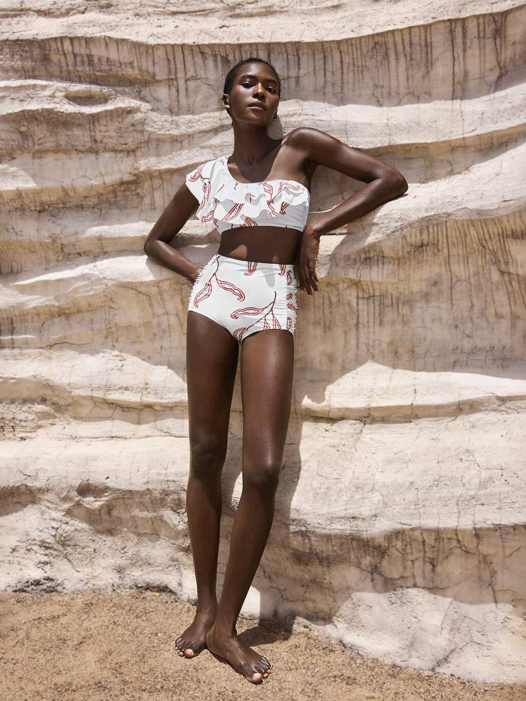 SHEIN Maija 女性用 全体プリント非対称襟フリル付きビキニ水着
