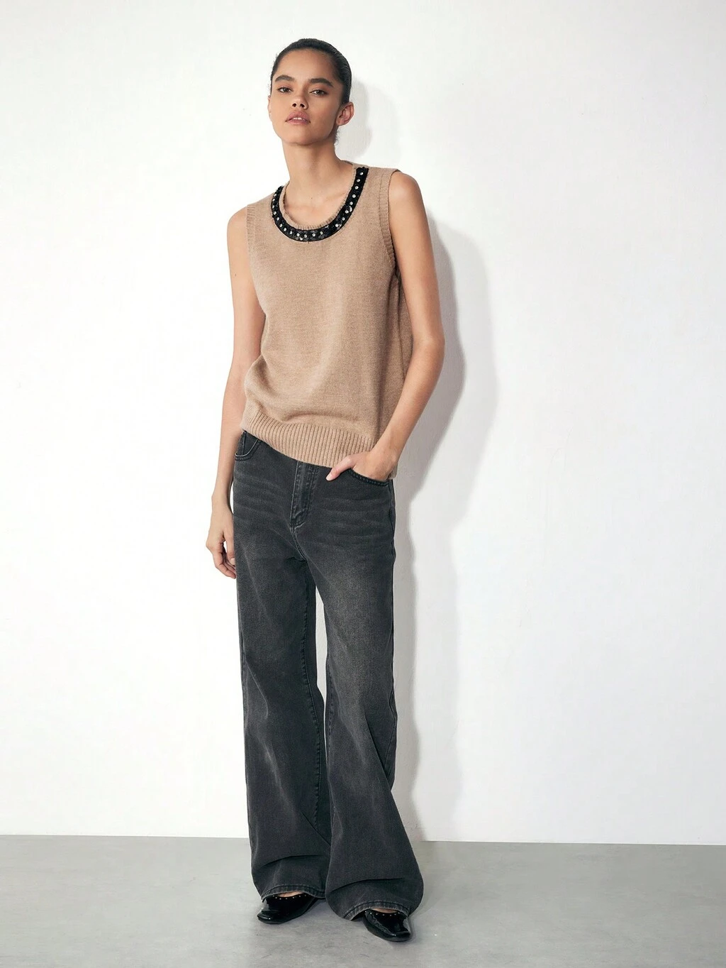 SHEIN Maija レディースアプリコットカジュアル ラインストーン飾り付きラウンドネックソリッドカラーシンプルスタイリッシュ長袖セーター、レジャーや日常着に適しています、秋/冬
