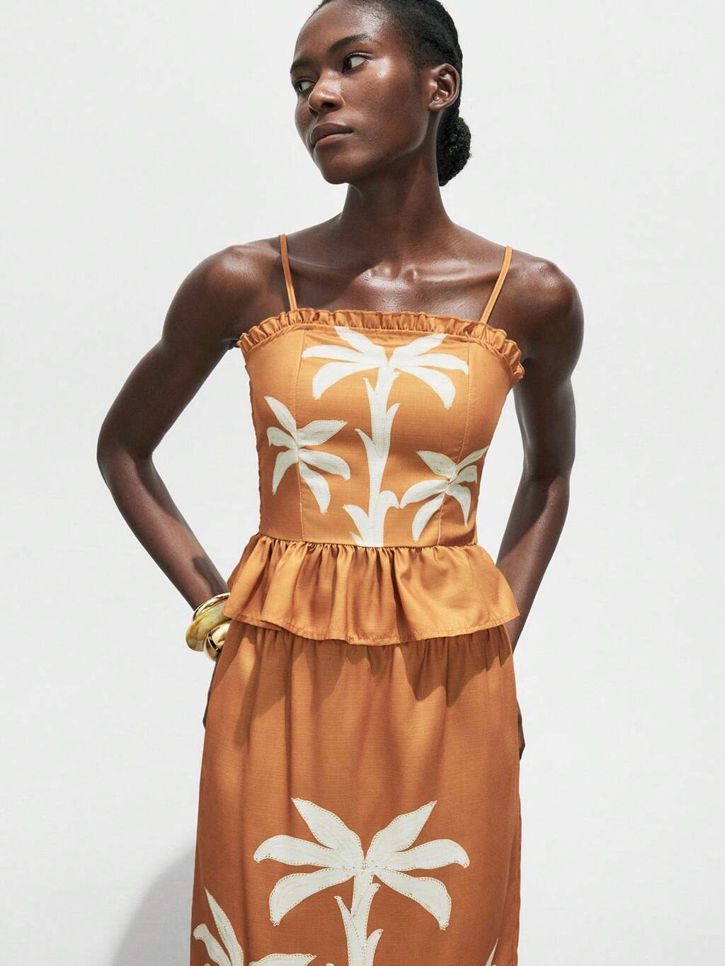 SHEIN Maija 女性用 夏オレンジ植物柄フリルヘム ノースリーブ スパゲッティストラップ バケーショントップ オープンショルダー ハワイアンスタイル
