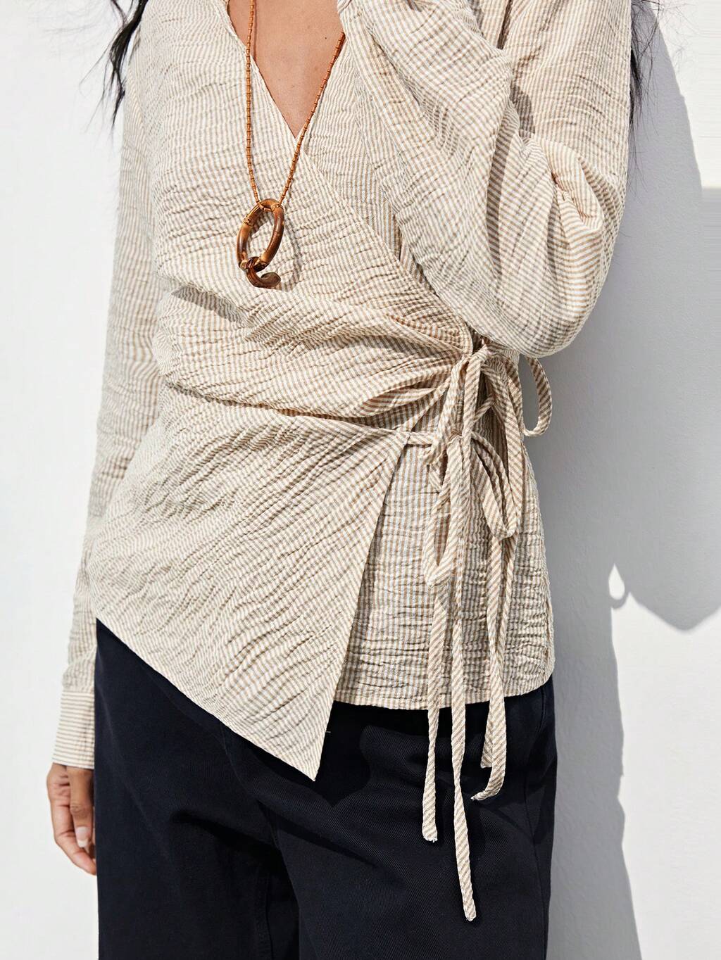 SHEIN Maija 女性用カジュアルストライプ リボン付きラップブラウス、春秋、夏休み、ビーチ、誕生日、外出用トップス、エレガント、バケーション