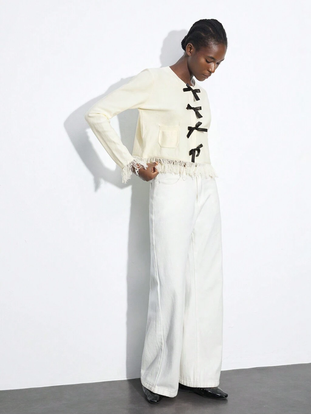 SHEIN Maija 女性用コントラストカラーファジーヘムリボンアクセントカーディガン、快適でモダンでエレガントなルーズドロップショルダーラウンドネックフロントオープンロングスリーブニットアウトフィット女性コンサート女性バケーション女性キュート