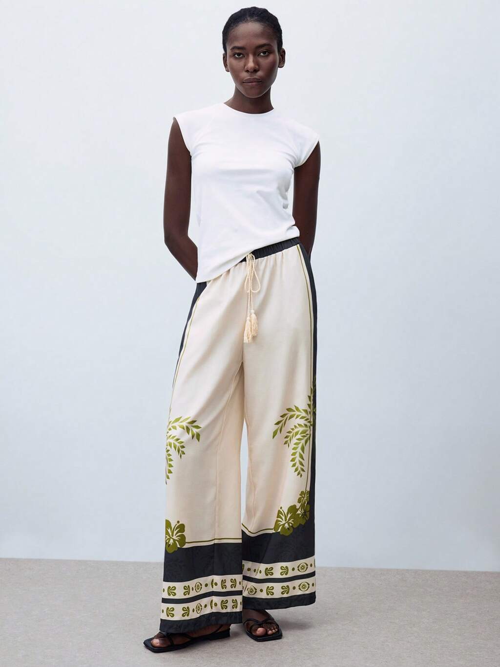 SHEIN Maija 女性用 植物柄 ウエストリボン コントラストカラー ワイドレッグパンツ、バカンス